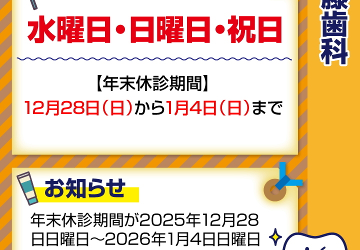 こんにちは。院長の伊藤です。 12月は古くから「師走」と呼ばれますが、 これはお坊さんが走り回るほど忙しくなることが 由来のひとつとされています。 年末に向けて公私の予定も重なり、 私たちも何かと慌ただしく感じる季節です。 忙しい合間を縫って、 「今年のうちにむし歯を治しておきたい」 と考えている方も多いのではないでしょうか。 実は、むし歯治 […]